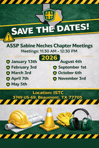 ASSP Sabine Neches Chapter Meeting – October 2026 October 6, 2026 11:30 am - 12:30 pm Topic TBA Speaker TBA Tickets Price Qty New Member (1st Time)show details +hide details - $0.00 USD Quantity 0 1 2 3 4 5 6 7 8 9 10 Details Sale Dates - The dates when this option is available for purchase. Goes On Sale: December 18, 2025 9:50 am Sales End: October 6, 2026 11:30 am Access - This option allows access to the following dates and times. Date Time Sold Remaining TotalSold Total SpacesLeft October 6, 2026 11:30 am to 12:30 pm 0 100 1 unlimited Membersshow details +hide details - $0.00 USD Quantity 0 1 2 3 4 5 6 7 8 9 10 Details Sale Dates - The dates when this option is available for purchase. Goes On Sale: December 18, 2025 9:50 am Sales End: October 6, 2026 11:30 am Access - This option allows access to the following dates and times. Date Time Sold Remaining TotalSold Total SpacesLeft October 6, 2026 11:30 am to 12:30 pm 1 99 1 unlimited Non Membersshow details +hide details - $15.00 USD Quantity 0 1 2 3 4 5 6 7 8 9 10 Details Price Name Description Amount Non Members $15.00 USD Total $15.00 USD Sale Dates - The dates when this option is available for purchase. Goes On Sale: December 18, 2025 9:50 am Sales End: October 6, 2026 11:30 am Access - This option allows access to the following dates and times. Date Time Sold Remaining TotalSold Total SpacesLeft October 6, 2026 11:30 am to 12:30 pm 0 100 1 unlimited please do not enter anything in this input Venue: ISTC Address: 3749 US 69, Beaumont, Texas, 77705, United States